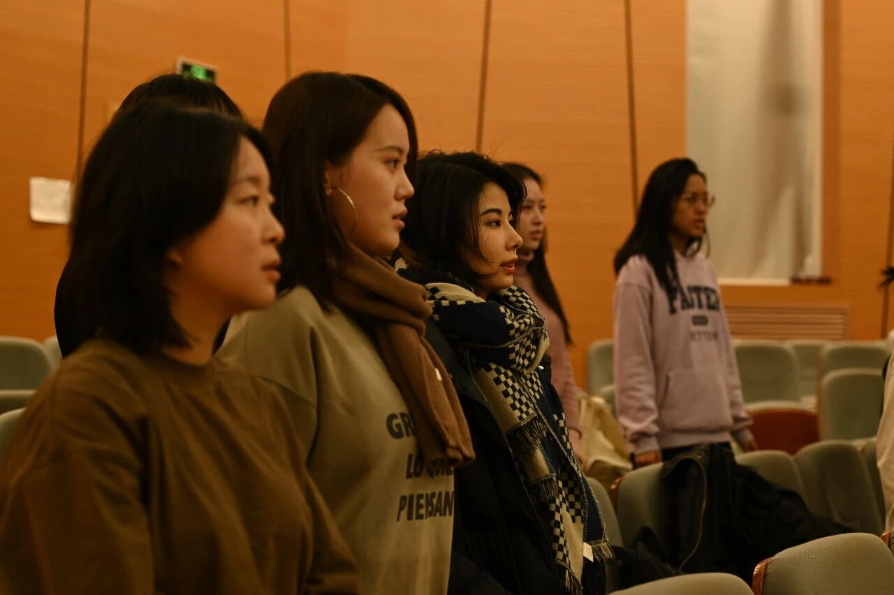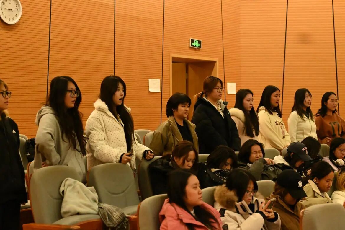 便定下“学生自主、以老带新”的排练模式。来自音乐系声乐专业的本科生李雨桐、曾丽、刘远涛、王粒沣等凭借专业功底扛起排练重任,从曲谱拆分到声部合练,从气息控制到情感表达,全程亲力亲为:逐句标注旋律重难点,用钢琴逐声部伴奏校准音准,将肢体律动融入合唱编排,让舞台呈现更具感染力。